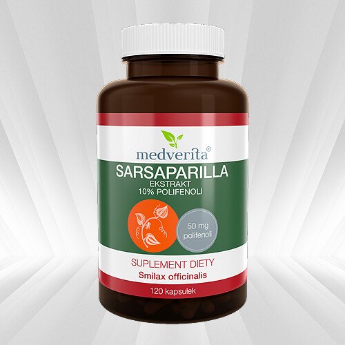 Sarsaparilla to nazwa roślin, która obejmuje różne gatunki kolcorośli. Preparat zawiera ekstrakt z korzenia Smilax officinalis standaryzowany na zawartość 10% polifenoli. Każda kapsułka zawiera 500 mg ekstraktu z korzenia kolcorośli, w tym aż 50 mg polifenoli.